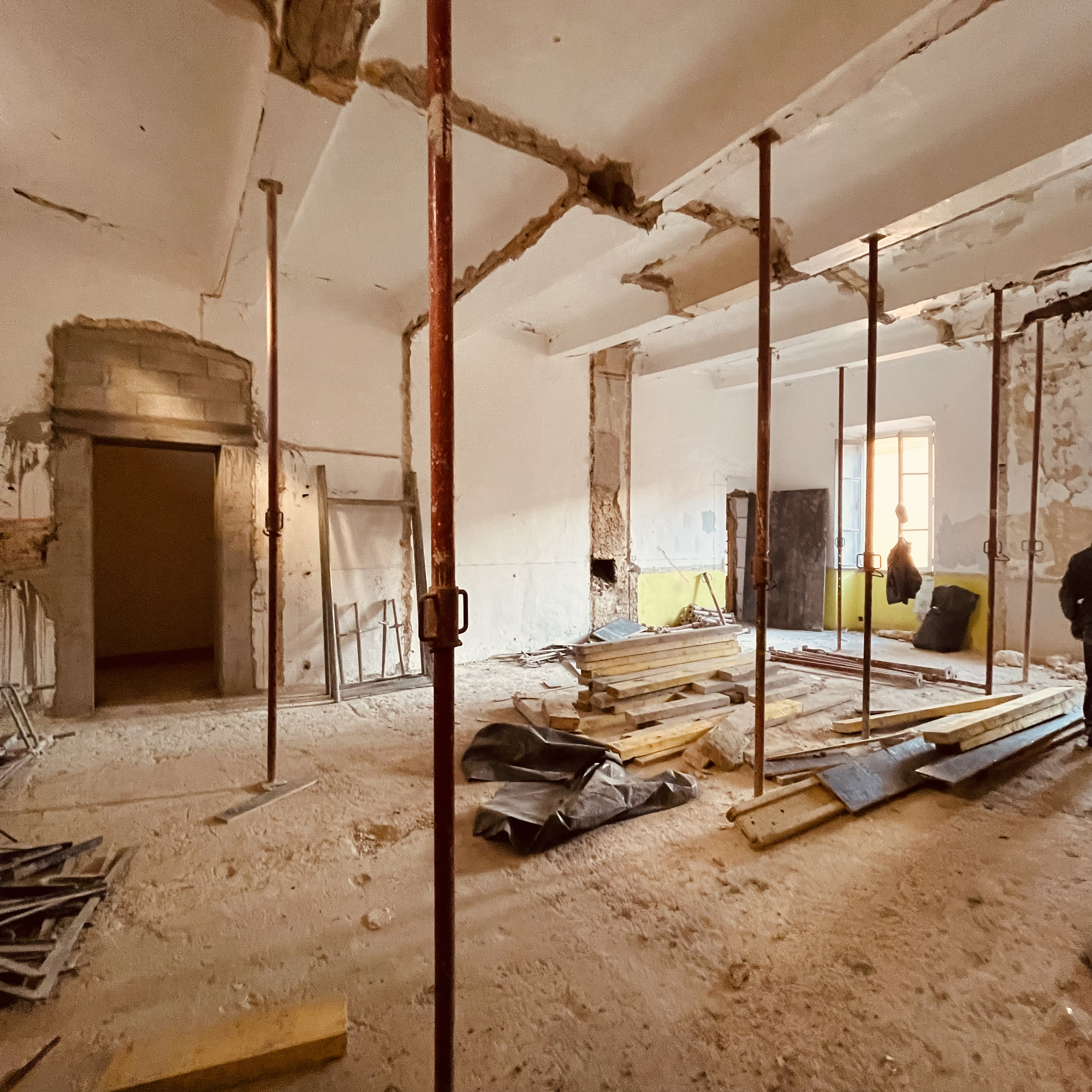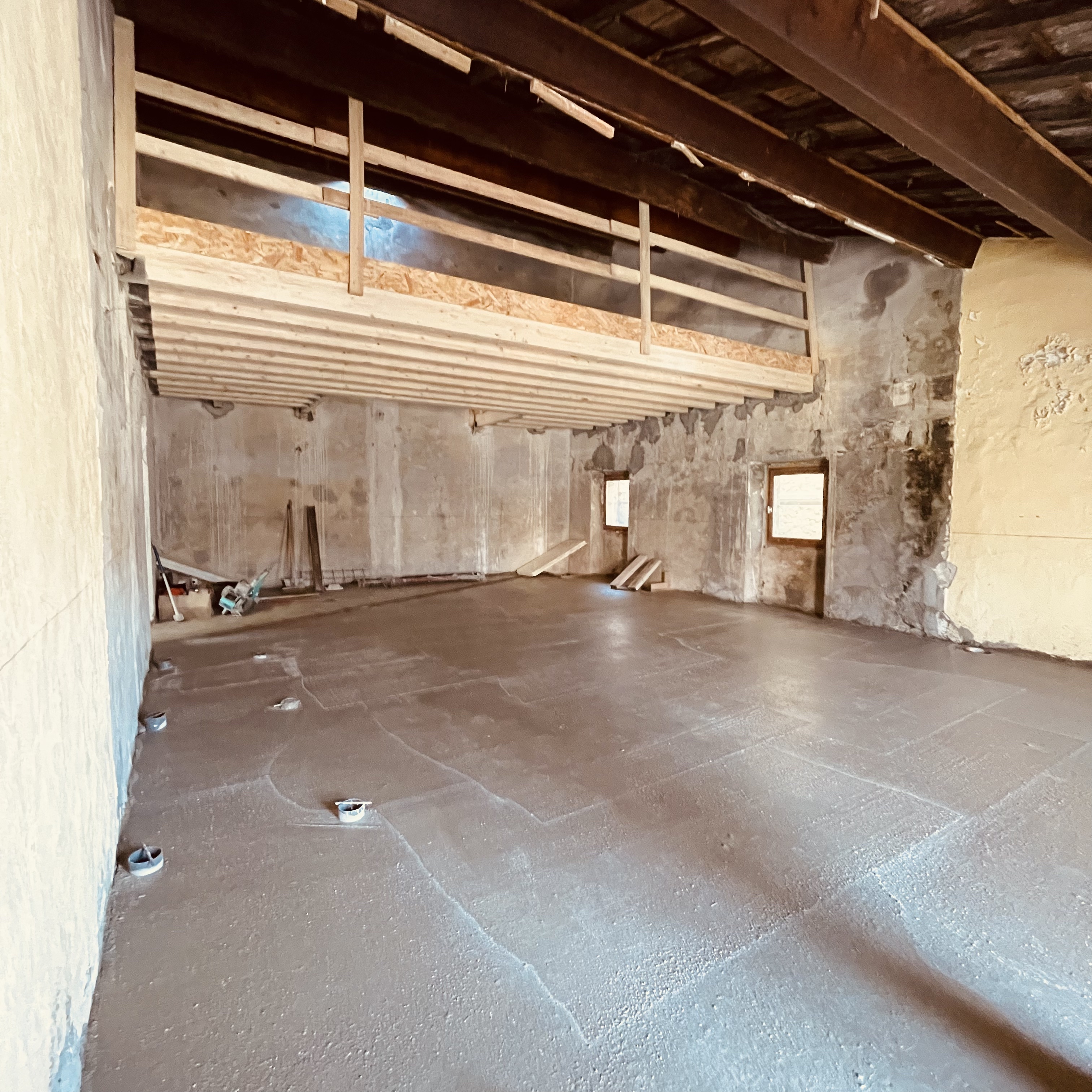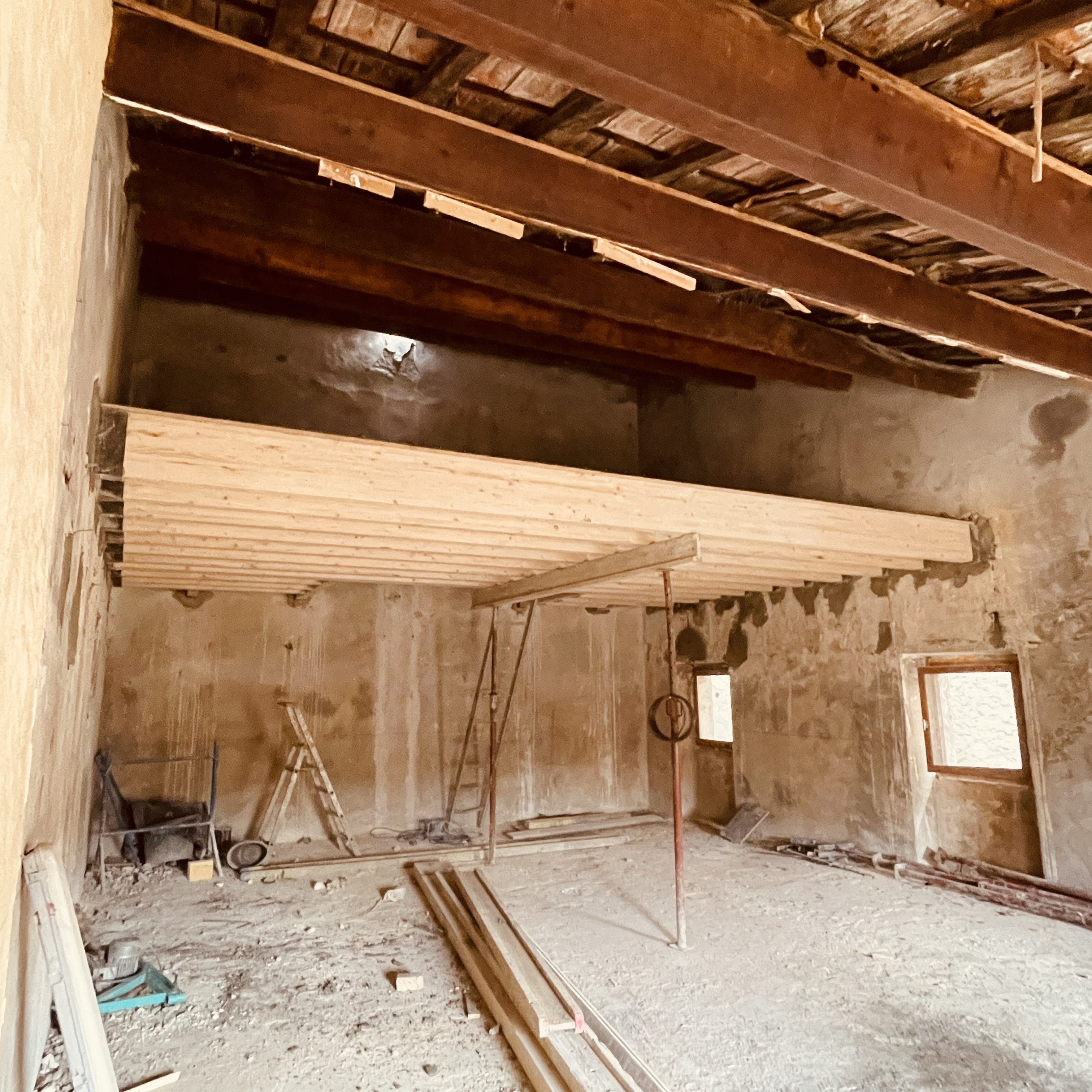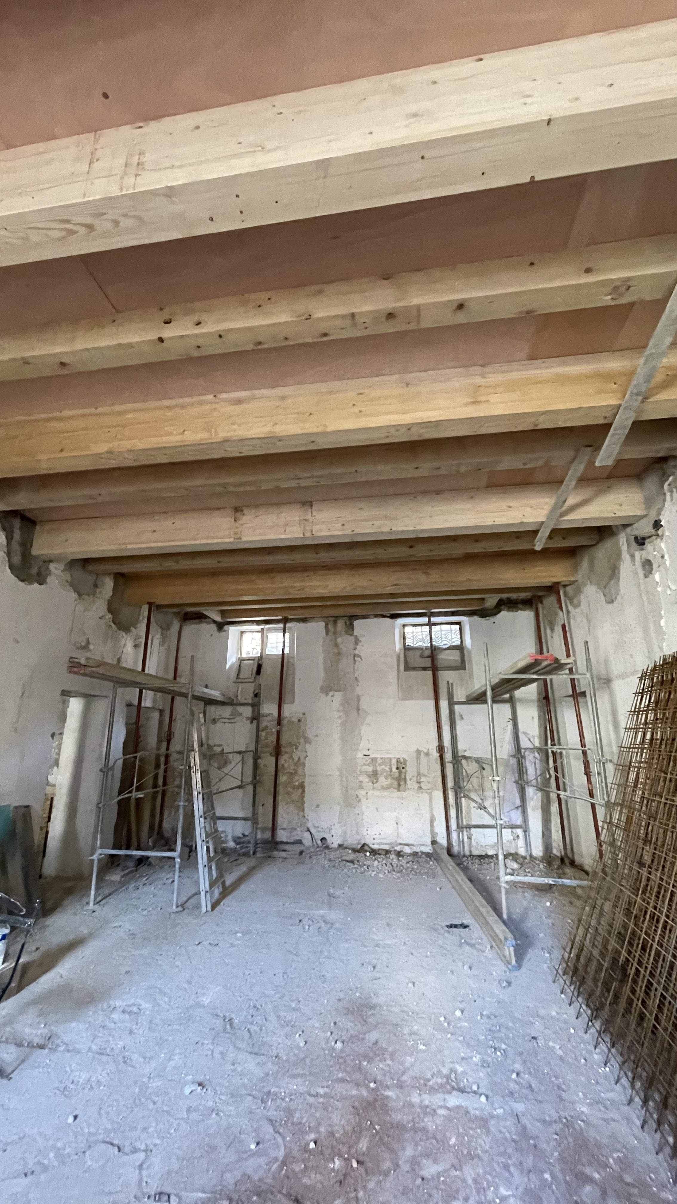 Tandis que les fouilles se poursuivaient au rez-de-chaussée, la réhabilitation structurelle des étages a été menée avec la création de nouveaux planchers en bois-béton connecté. La charpente a été reconstruite à l’identique et les tuiles anciennes en bon état ont été réemployées.