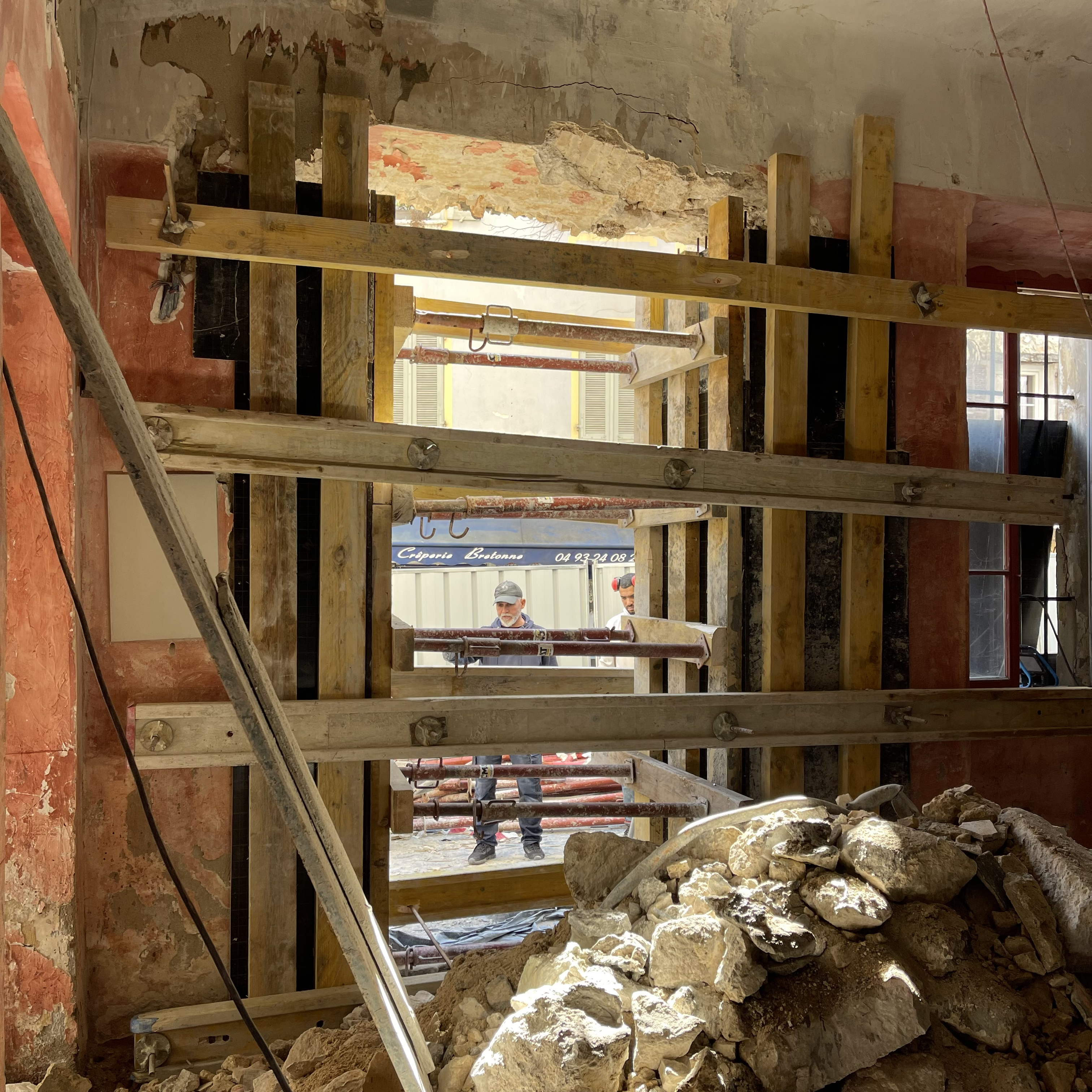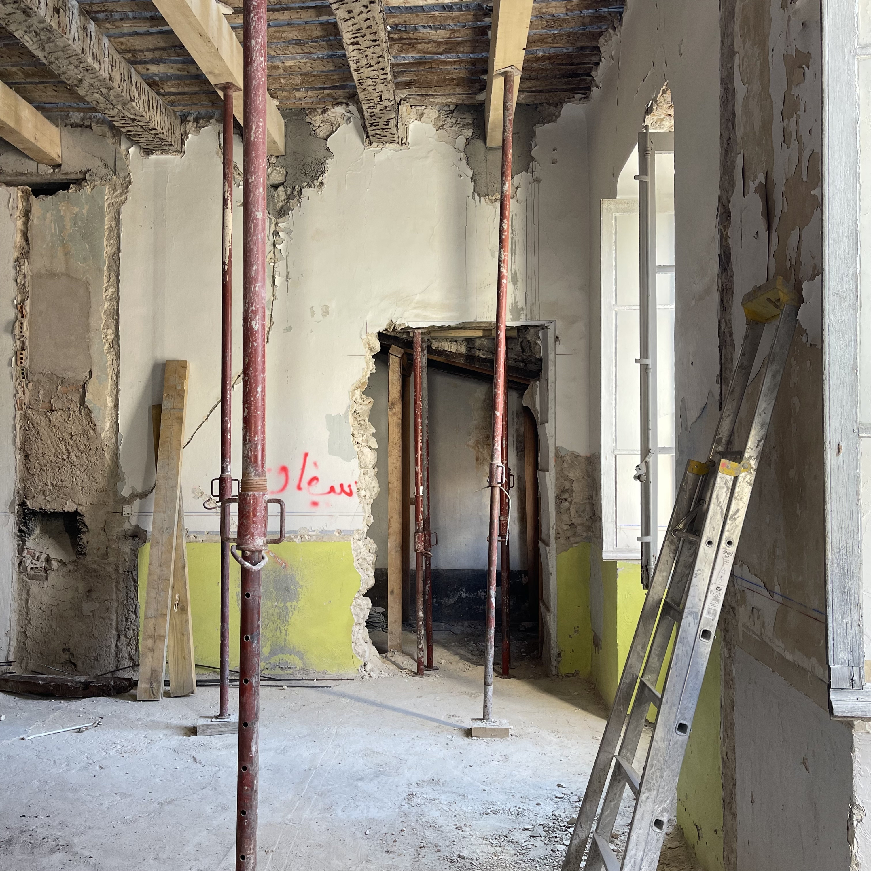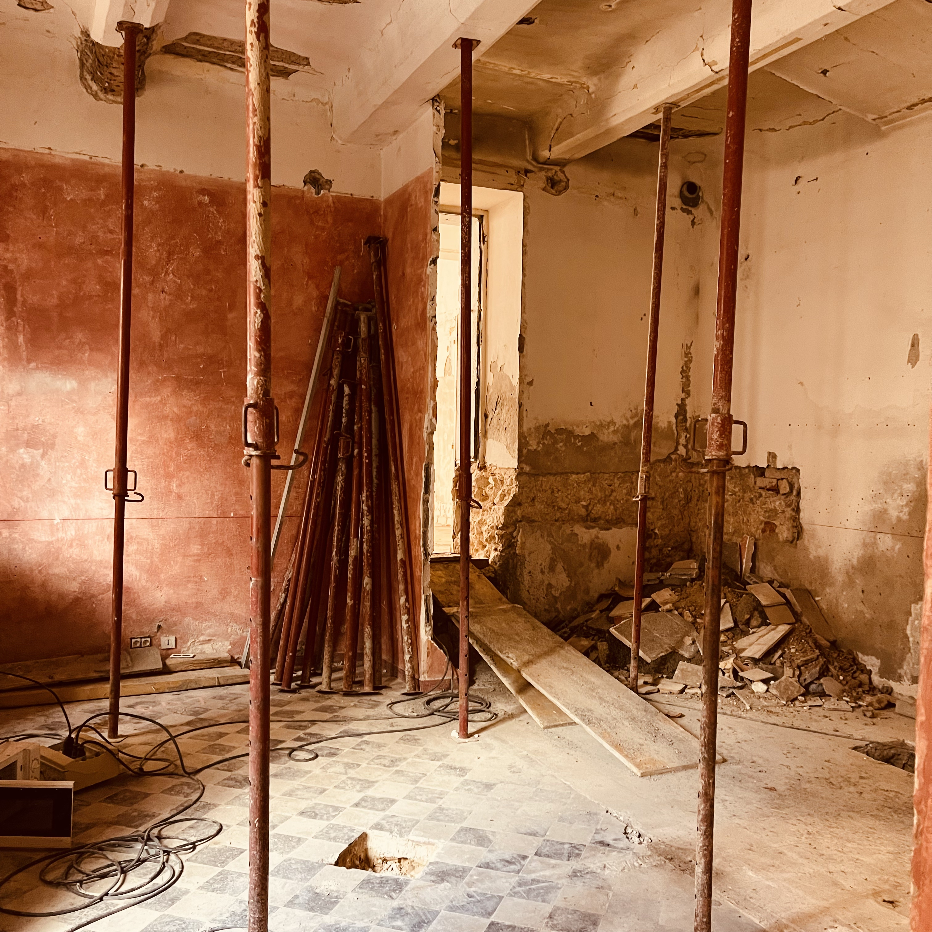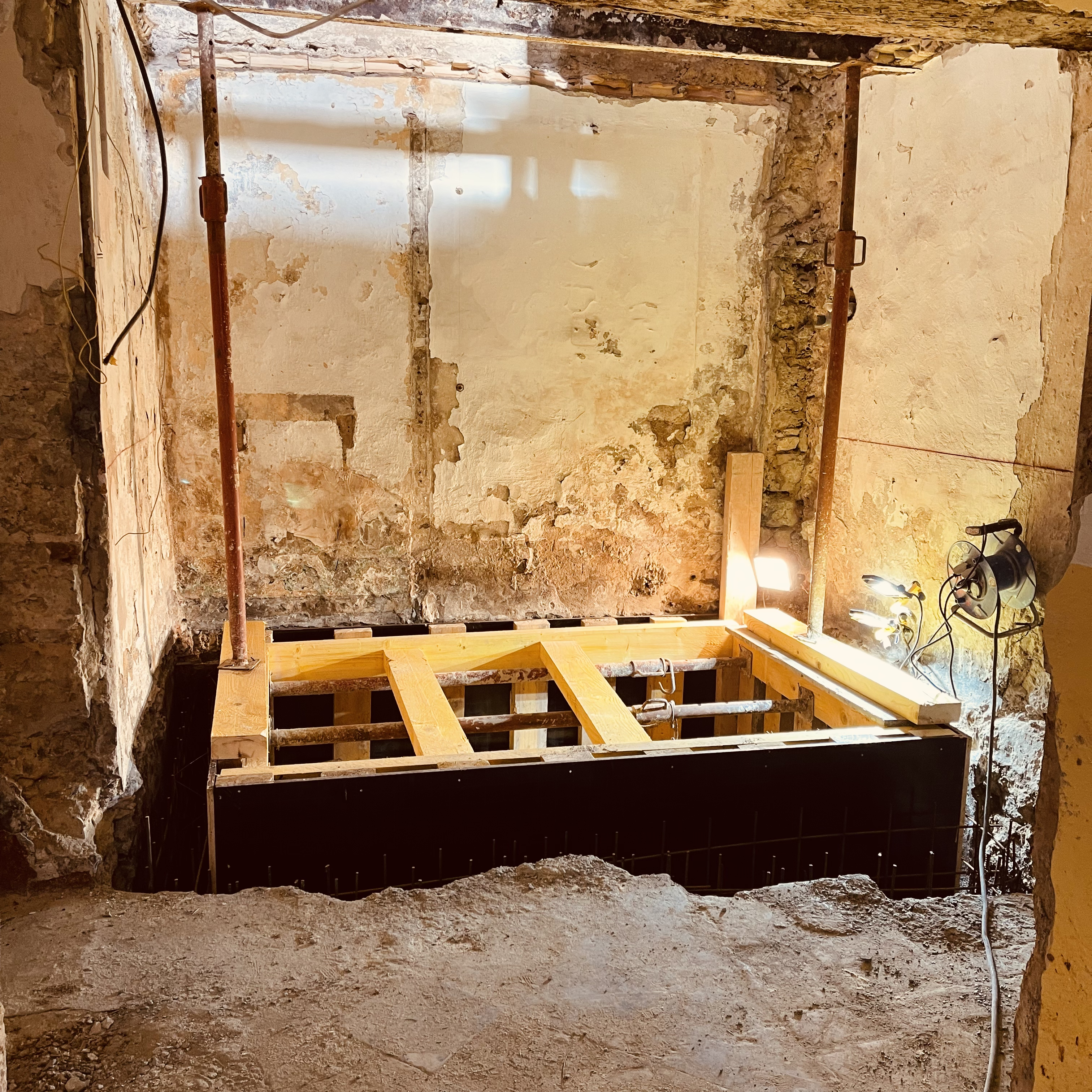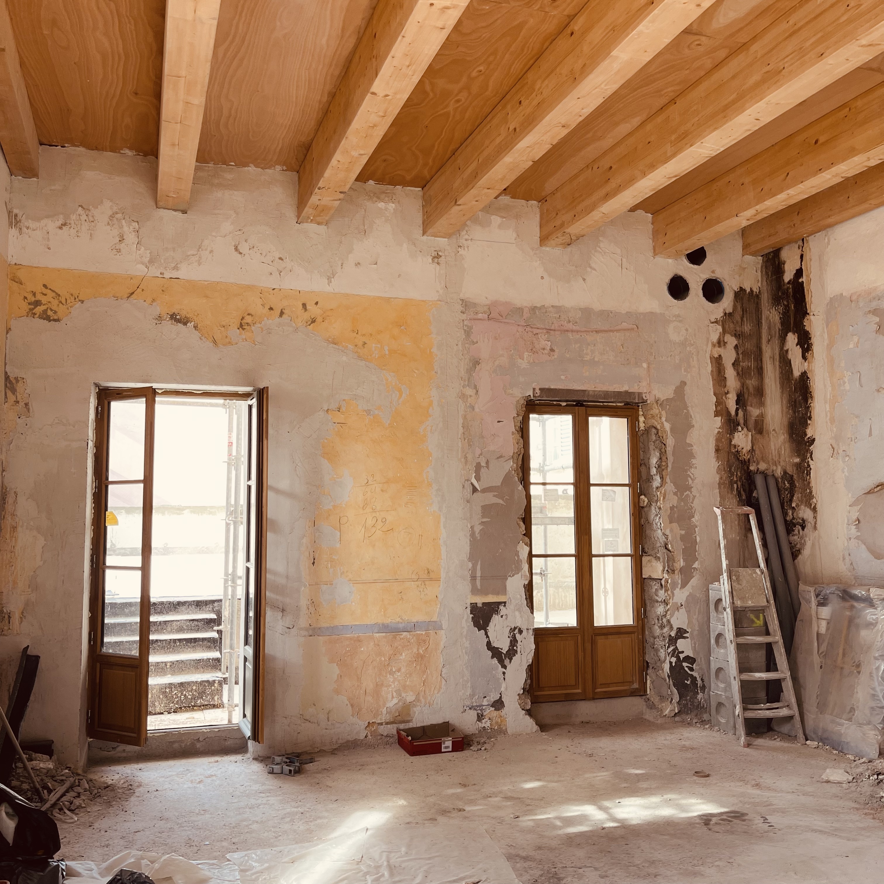 Tandis que les fouilles se poursuivaient au rez-de-chaussée, la réhabilitation structurelle des étages a été menée avec la création de nouveaux planchers en bois-béton connecté. La charpente a été reconstruite à l’identique et les tuiles anciennes en bon état ont été réemployées.