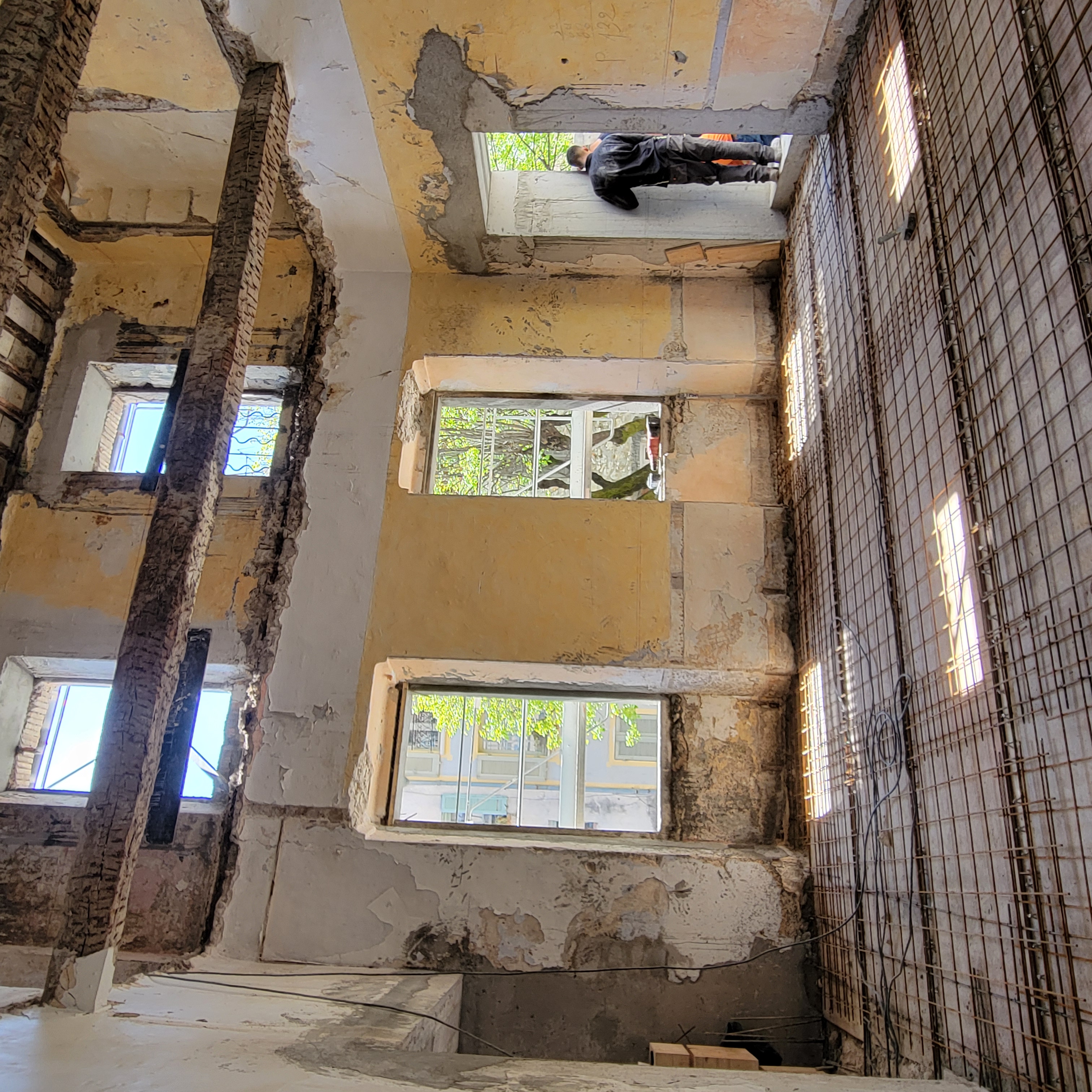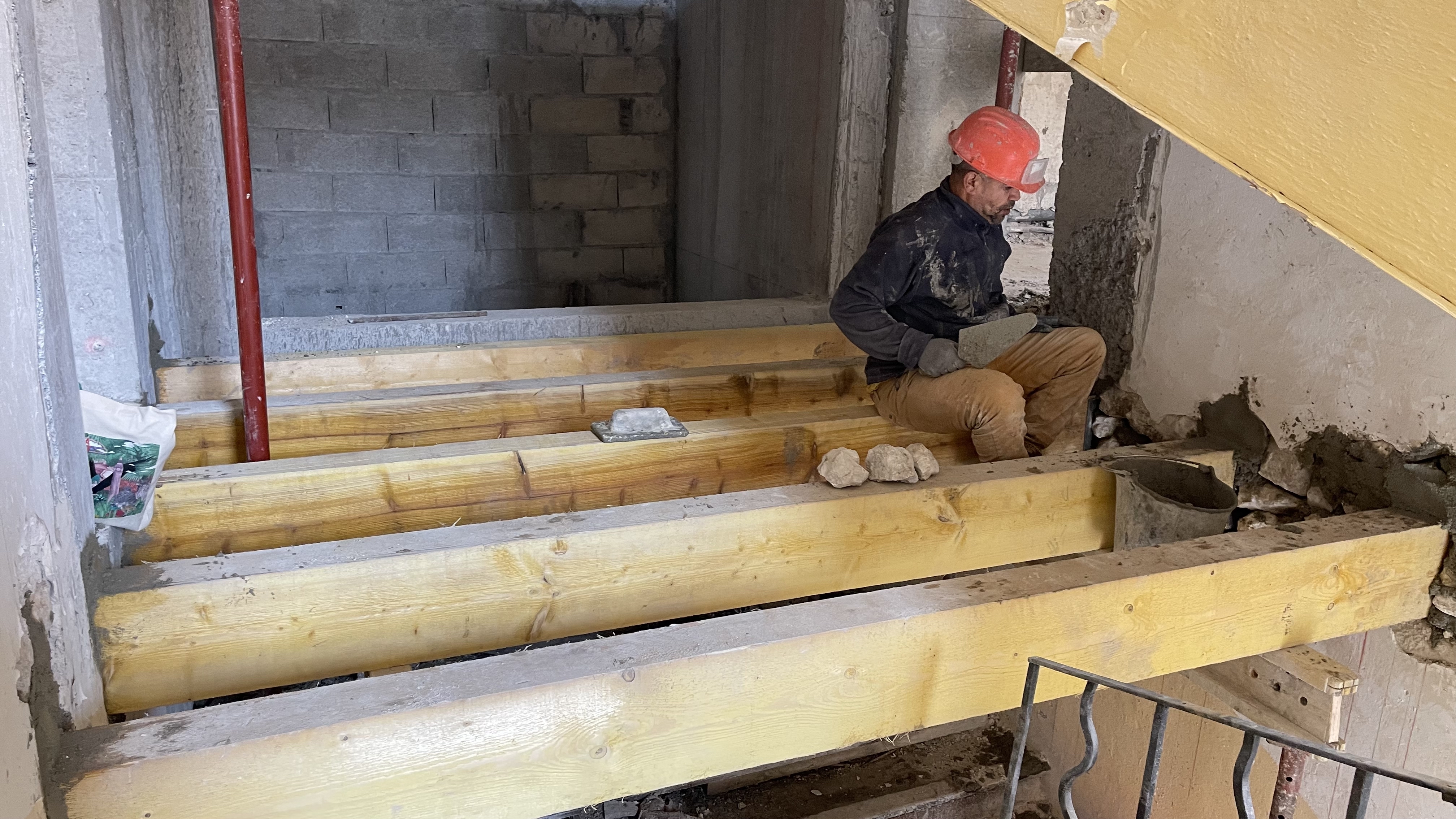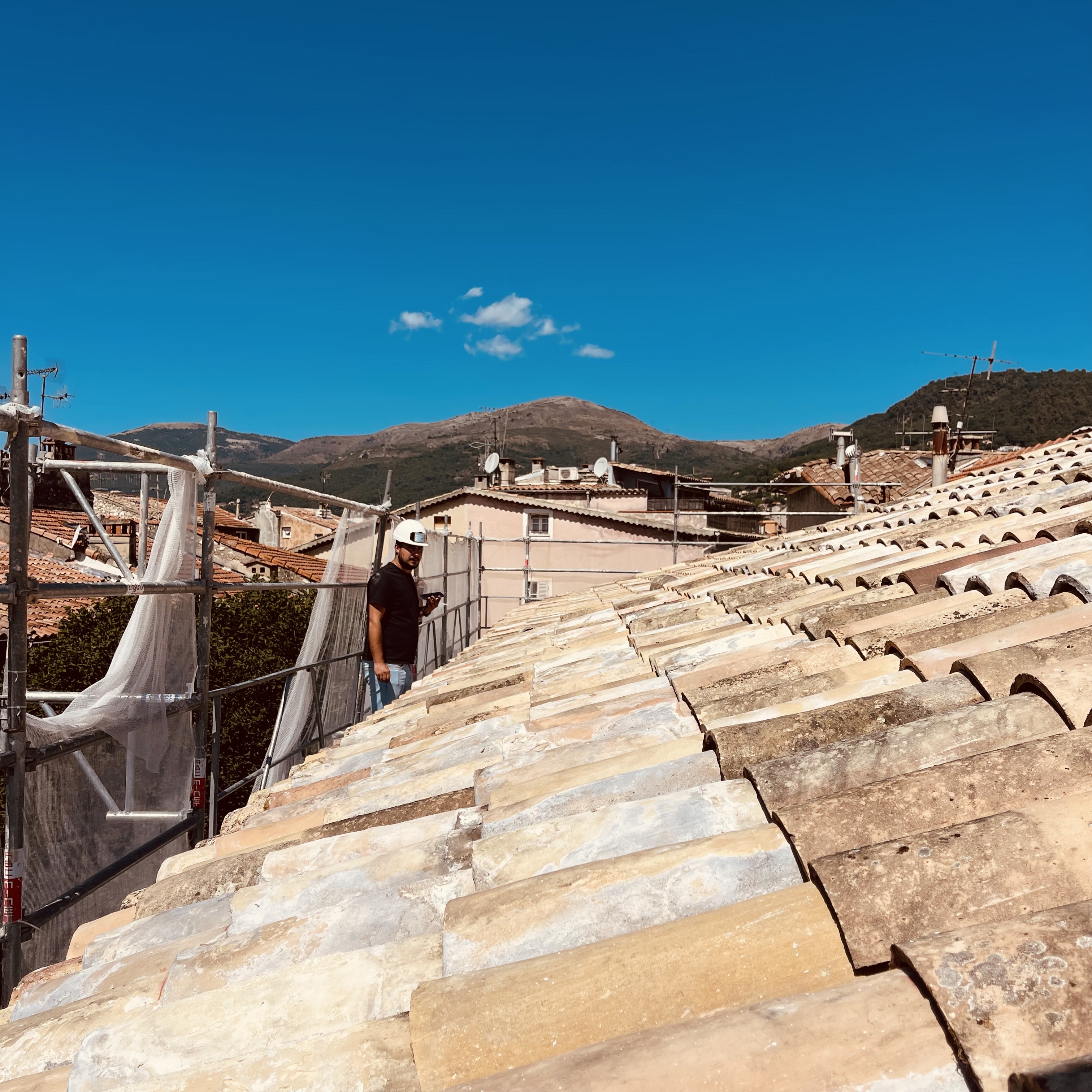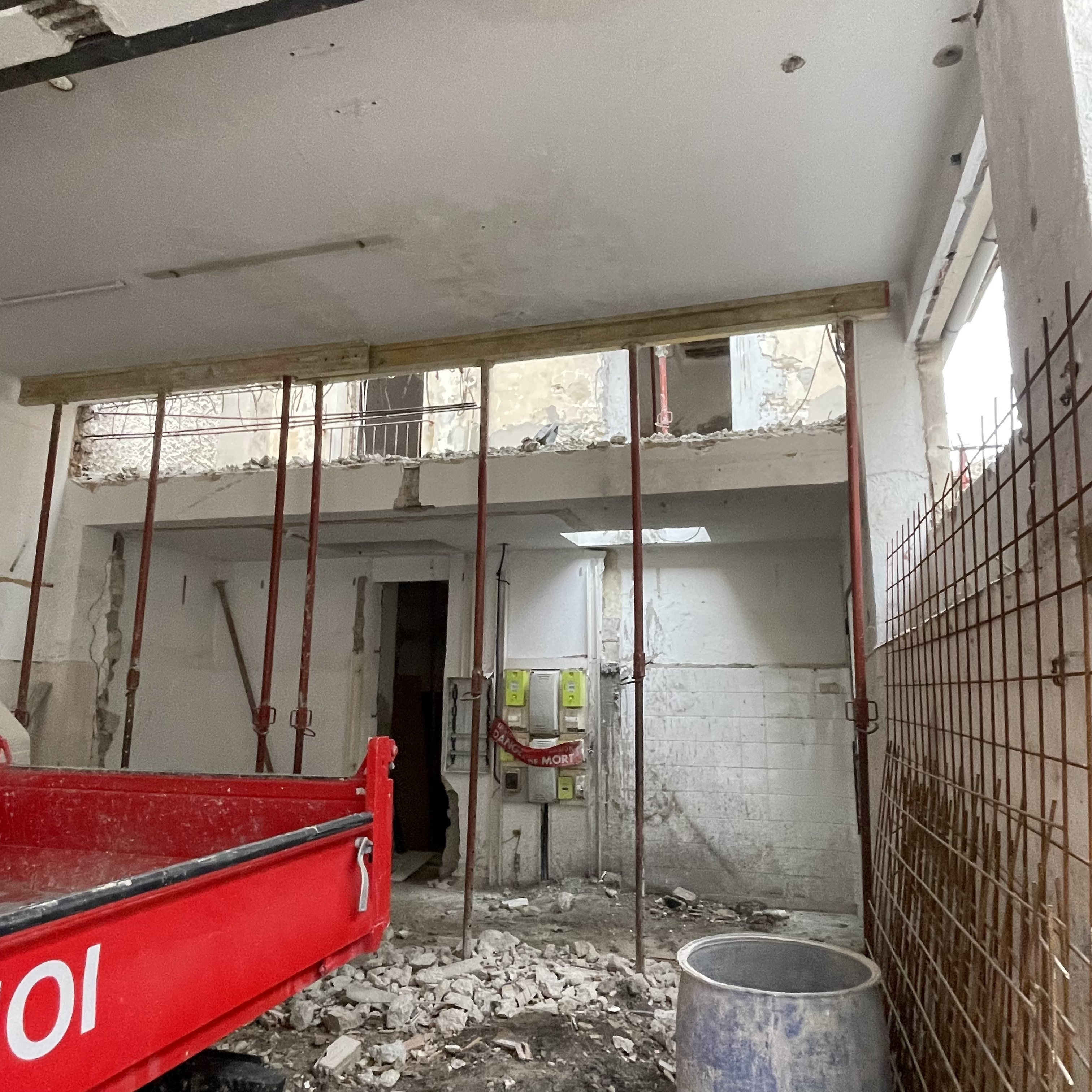 Tandis que les fouilles se poursuivaient au rez-de-chaussée, la réhabilitation structurelle des étages a été menée avec la création de nouveaux planchers en bois-béton connecté. La charpente a été reconstruite à l’identique et les tuiles anciennes en bon état ont été réemployées.