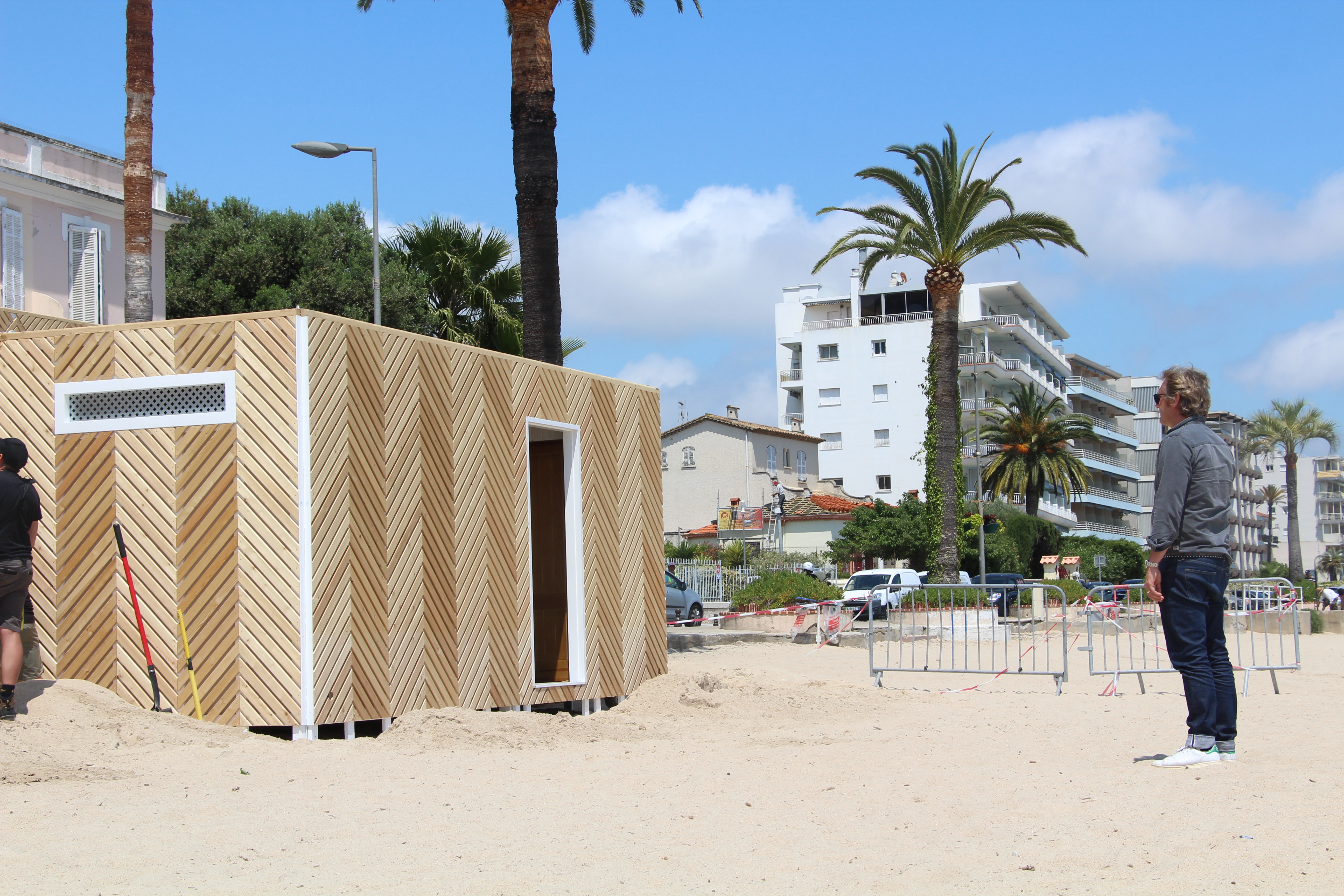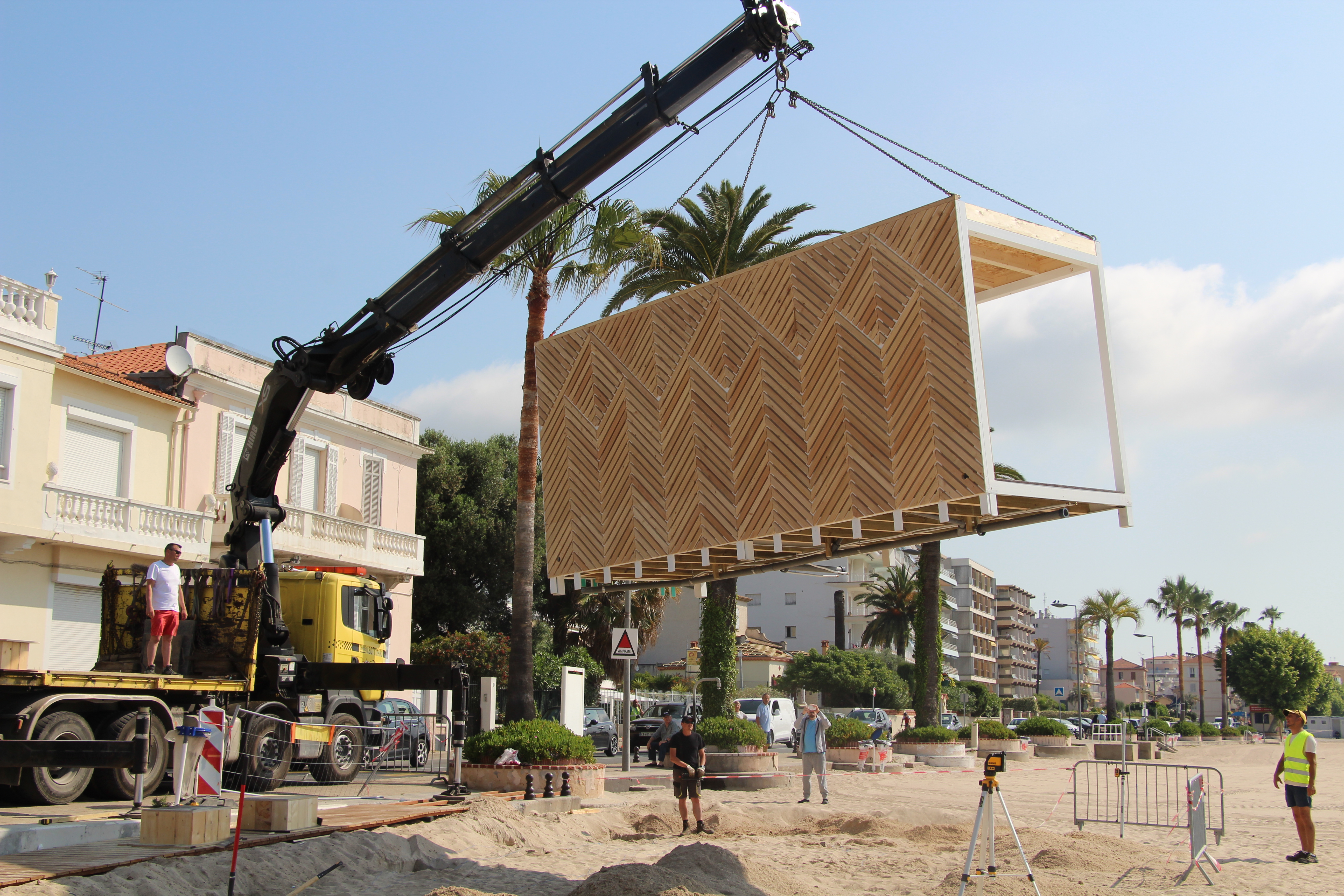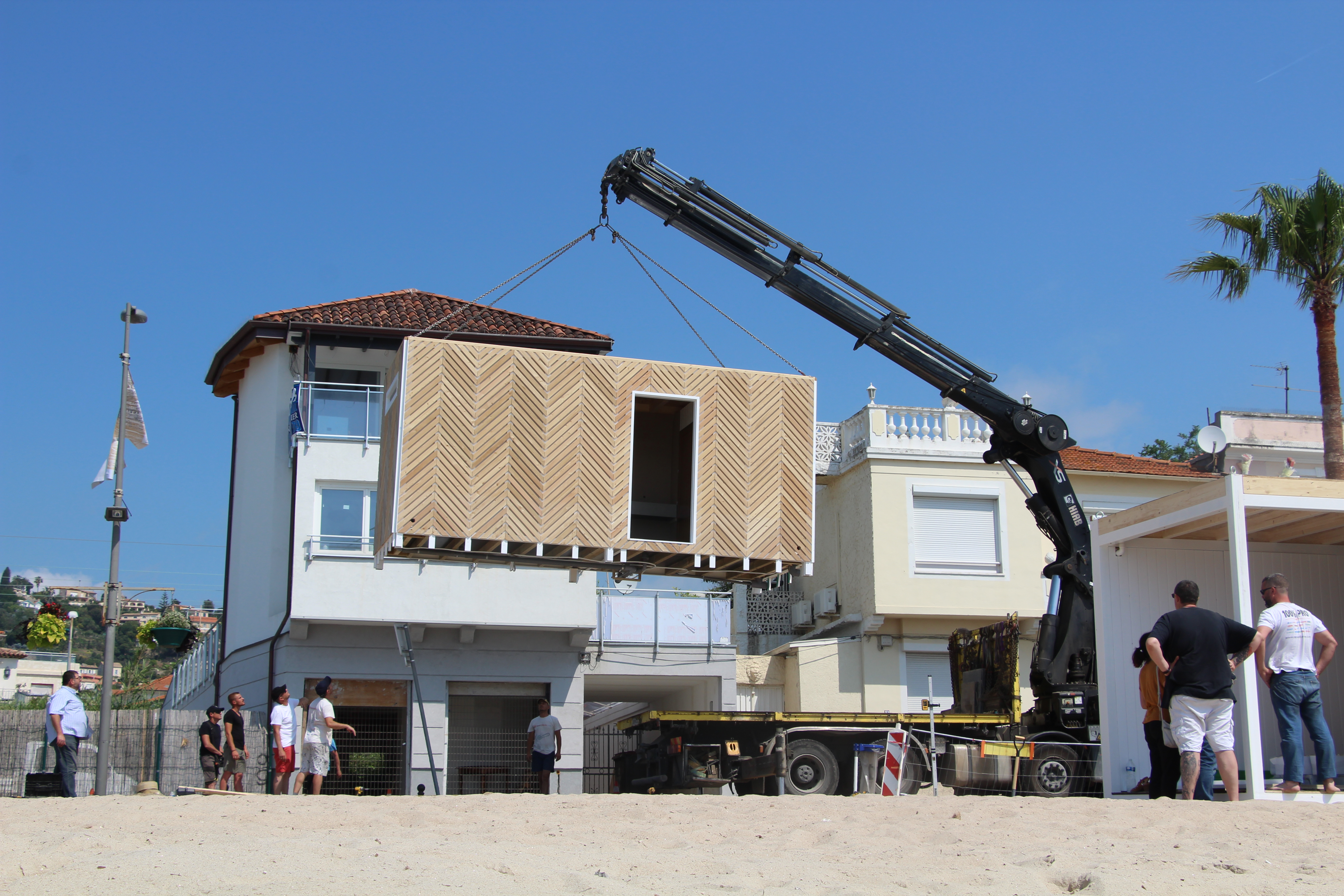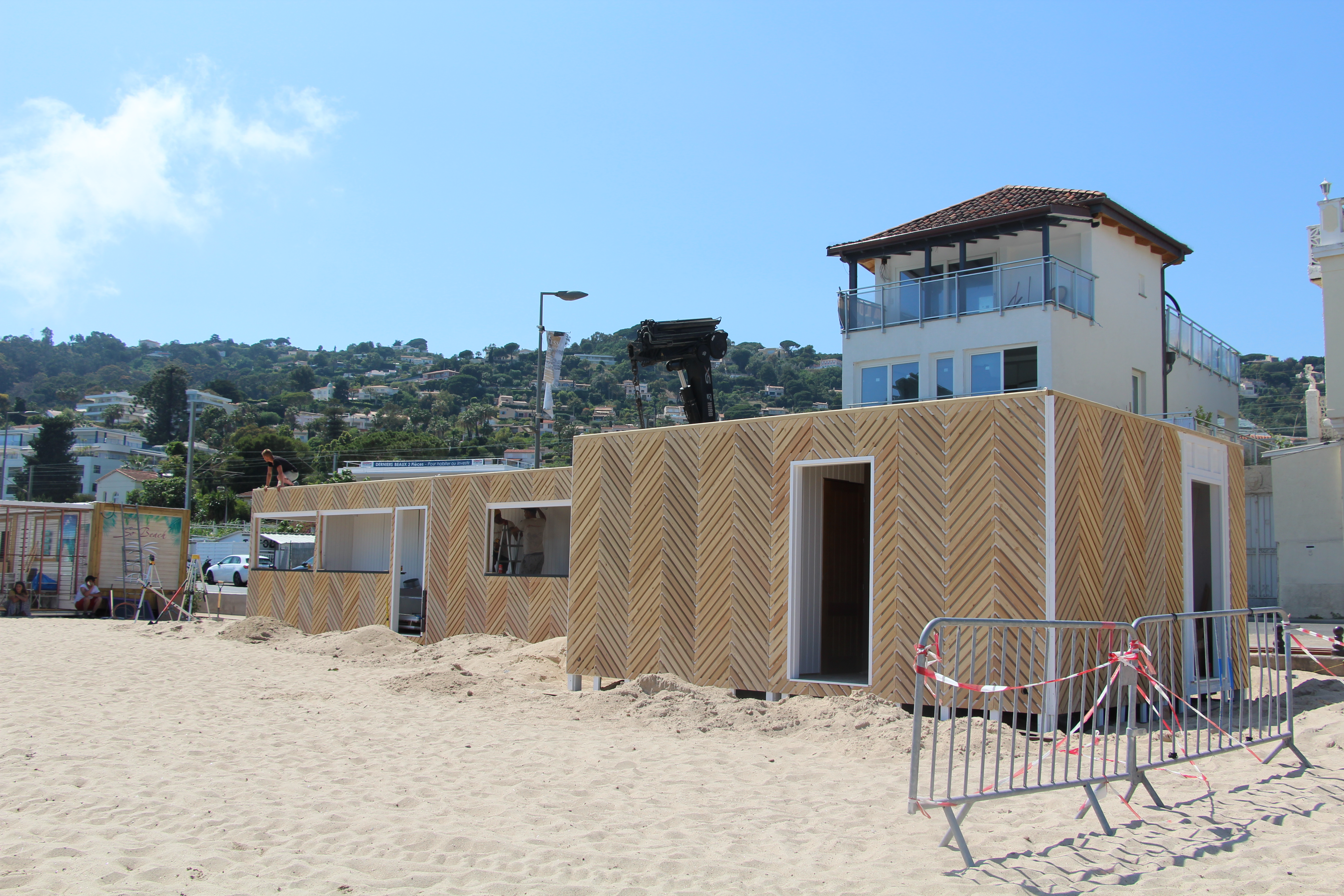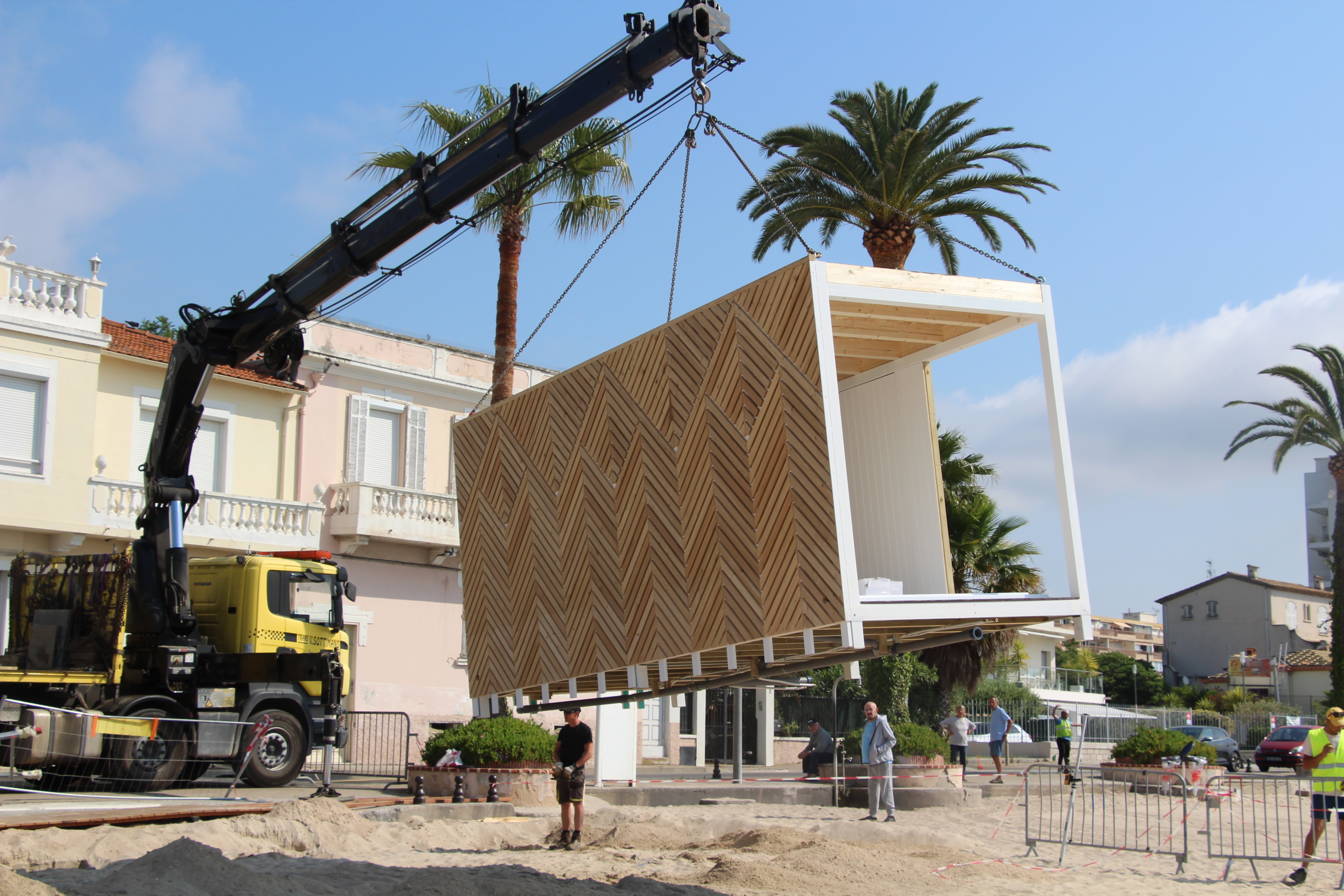 Sur la plage de Golfe-Juan, 4 volumes de la taille d’un conteneur, sont assemblés. ils sont transportables par camion et sont stockés durant l’hiver, pour laisser la plage libre.