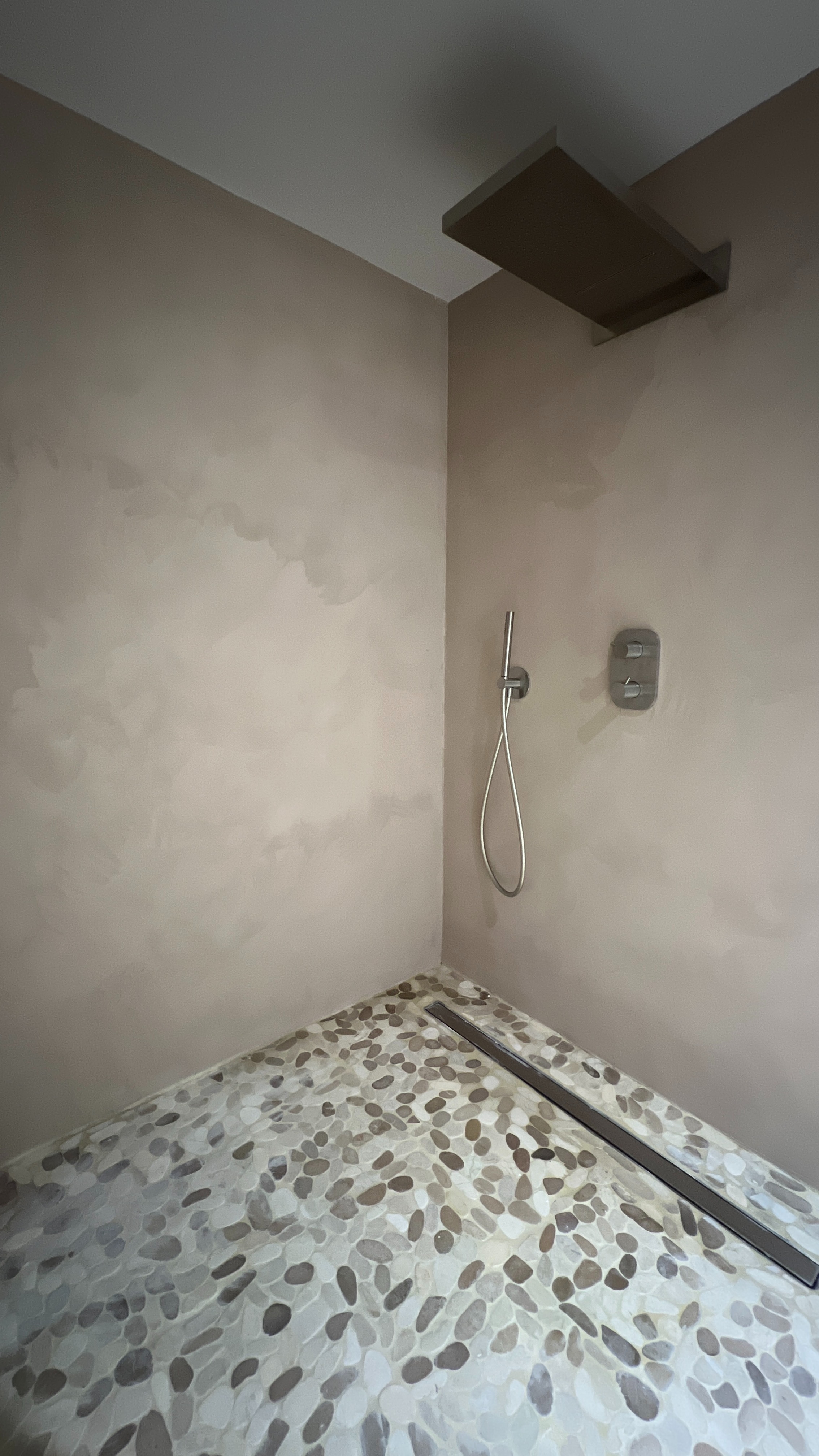 Matériaux : Murs en pierre / menuiseries aluminium / calade en galets / mobilier bois / poêle à bois